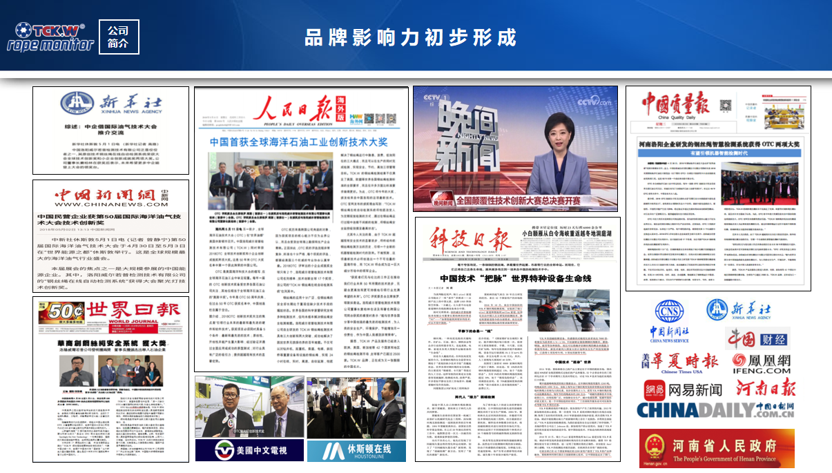 Luoyang Wire Rope Inspection Technology Co., Ltd. (short for TCK.W) is a national double-high, double-soft enterprise specializing in the research of non-destructive flaw detection technology of ferromagnetic materials and a specialized, high-end and innovation-driven enterprise in Henan Province.