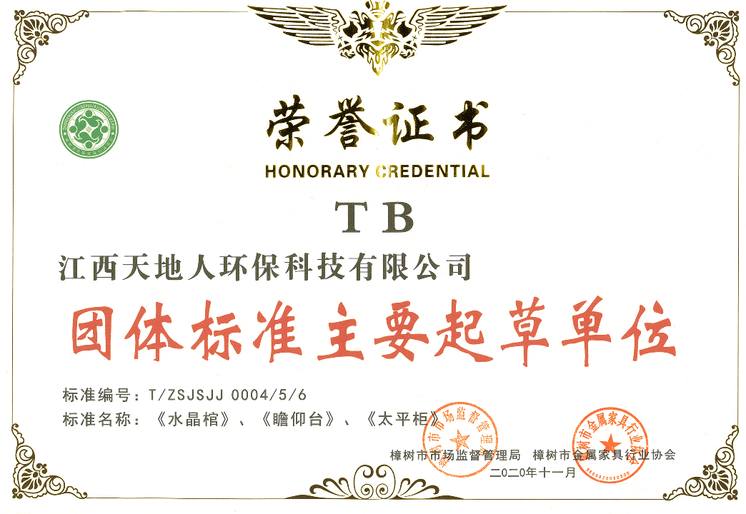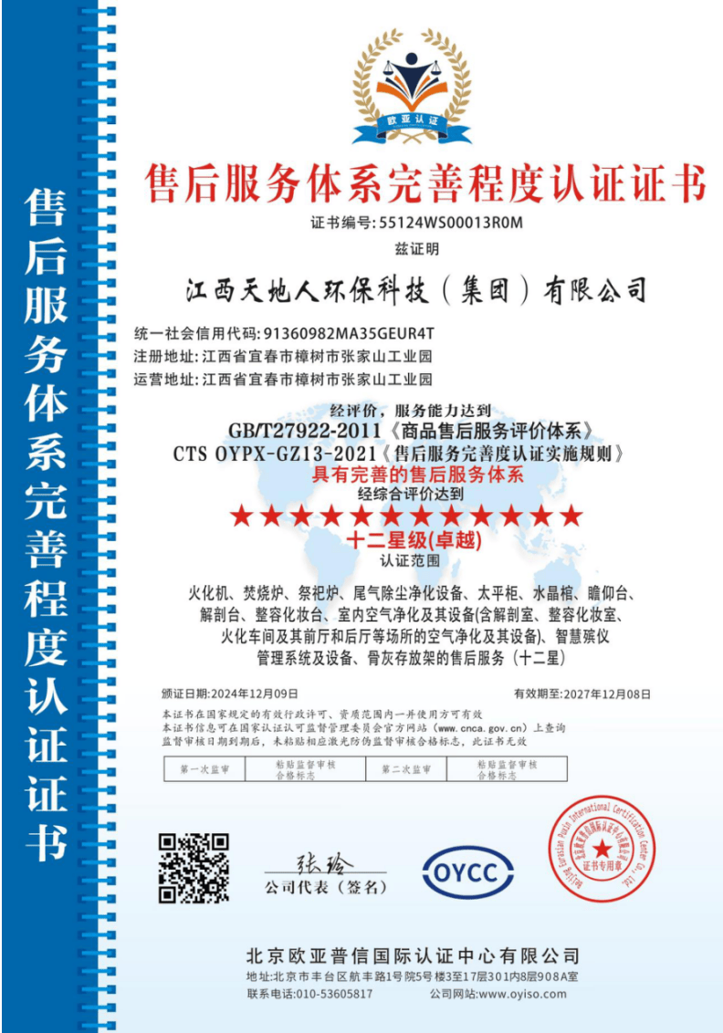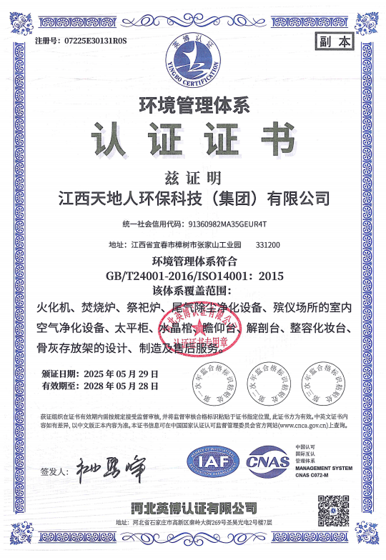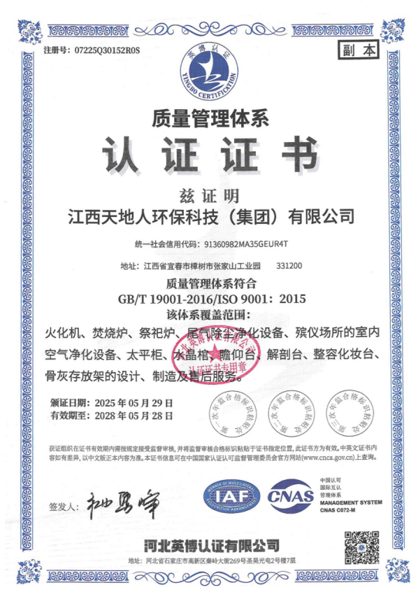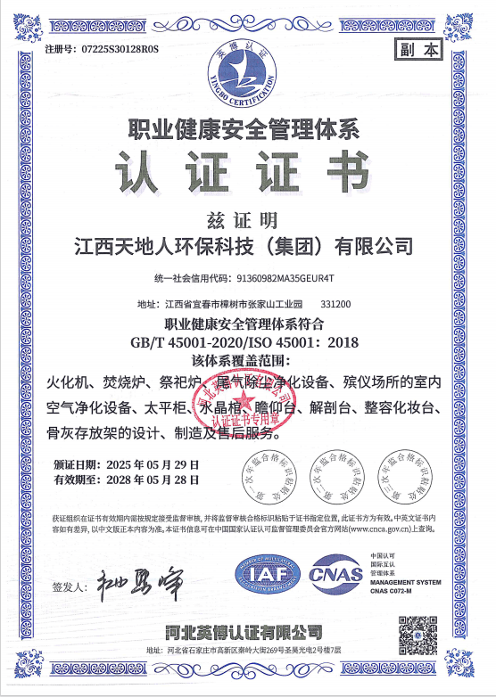 Tiandiren Group takes a global perspective while being rooted in China. With a broad vision and advanced environmental protection technology, it has won the favor of customers worldwide. The group has successfully passed the GB/T 23001-2017 Integration of Informatization and Industrialization Management System Assessment, ISO 9001 Quality Management System Certification, ISO 14001 Environmental Management System Certification, and ISO 45001 Occupational Health and Safety Management System Certification. Its cremation equipment and exhaust gas purification treatment equipment have passed the national emission standard testing and certification under GB 13081-2015 jointly conducted by the National Analysis and Testing Center of the Ministry of Ecology and Environment and the China Funeral Association, achieving leading environmental performance nationwide. The company has also obtained the Environmental Pollution Control Qualification Certificate issued by the provincial environmental protection department and the Funeral Supplies Enterprise Qualification Certificate issued by the provincial civil affairs department. Its indoor air purification and refrigeration equipment have passed testing and certification by the Industrial and Information Products Supervision and Inspection Institute, achieving full coverage of authoritative testing for its main products. Tiandiren Group is a member of the China Funeral Association, a council member of the China Funeral Vocational Education Group, the deputy director unit of the Funeral Industry Expert Committee of "China Philanthropy Times," a member of the China Environmental Protection Industry Association, a member of the China Association for Quality, and the vice president unit of the Jiangxi Provincial Funeral Association. The company continuously promotes the principle of "refining and innovating" its products. It has been recognized by the Jiangxi Provincial Department of Industry and Information Technology as a "Specialized, High-end and Innovation-driven" enterprise, a provincial science and technology-based small and medium-sized enterprise, a leading key enterprise in provincial industry-finance cooperation, and an excellent exhibitor at the China International Funeral Equipment and Supplies Expo. Its cremators and exhaust gas purification treatment equipment have been included in the Ministry of Civil Affairs' funeral service guarantee capacity filing enterprises. After years of trials and hardships, the group adheres to the corporate spirit of "Unity, Dedication, Efficiency, and Innovation," continuously absorbing international mature technologies and experience. More than 30 software copyrights for its cremator control system, exhaust gas purification treatment equipment control system, and refrigeration equipment control system have been registered and protected after review by the China Copyright Protection Center. The State Intellectual Property Office has granted the company more than 50 patents. The company has also been honored with the national "High-tech Enterprise" title. The Municipal Bureau of Industry and Information Technology has authorized the group to participate in the national industrial cluster regional brand building pilot project for the Zhangshu metal furniture industry granted by the Ministry of Industry and Information Technology. The group's new generation of intelligent colorful cremators, incinerators, exhaust gas purification treatment equipment, intelligent mortuary refrigerators, intelligent viewing platforms, and crystal coffins have been rated as "Jiangxi Famous Brand" products. The group's main products — mortuary refrigerators, farewell balconies, crystal coffins, and storage racks — have worked with the provincial standards institute to formulate group standards, moving toward higher industry standards.