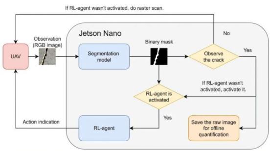 The autonomous crack detection framework relies on deep reinforcement learning to train an autonomous agent capable of adaptively tracking crack patterns. This agent can navigate independently without human intervention and intelligently adjust its search strategy based on crack features to maximize detection efficiency. Research data show that the system successfully captured over 85% of cracks in the training dataset and achieved 82% coverage in the test dataset. Moreover, compared to traditional exhaustive search methods, the new system improved computational resource efficiency by 64%, demonstrating significant potential for practical deployment on drones and other edge devices.