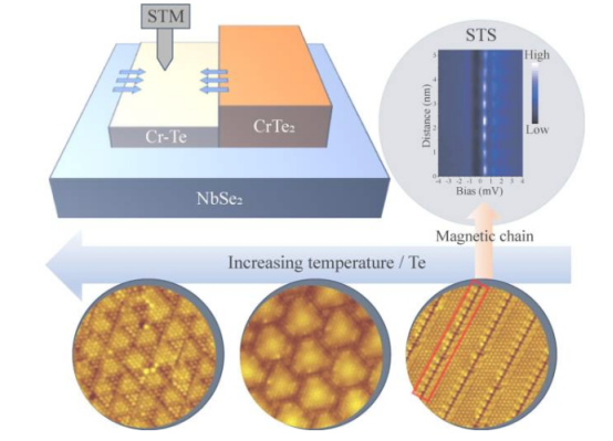 Researchers published a paper in Materials Futures introducing a novel sub-monolayer CrTe₂ / NbSe₂ heterostructure. By precisely depositing Cr and Te on an NbSe₂ substrate, they observed a two-stage growth process: A compressed Cr-Te layer with a 0.35nm lattice constant; An atomically flat CrTe₂ monolayer with a 0.39nm lattice constant. Annealing the Cr-Te layer triggers stress-release reconstruction, forming stripe-like patterns with localized magnetic moments at the edges—effectively creating one-dimensional magnetic chains.