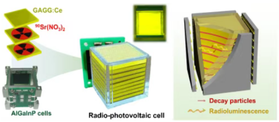 To address the low conversion efficiency and low output power of traditional radiovoltaic isotope batteries, the CIAE Nuclear Technology Integrated Research Institute project team innovatively proposed an Sr-90 radiovoltaic isotope battery based on a scintillation light-guiding concentrator structure. Using cerium-doped gadolinium gallium aluminum garnet (GAGG:Ce) to build a concentrator light-guide transduction structure, and coupling and stacking it alternately with an Sr-90 radiation source, the design enables efficient transport and concentrated emission of scintillation light. Combined with a spectrally matched AlGaInP photovoltaic module, the battery's volumetric energy density and output power are significantly enhanced. Tests show that a single-module prototype achieves an output power of 48.9μW and an energy-conversion efficiency of 2.96%. Multi-module integration can further realize milliwatt-level output, with both the transduction efficiency and output power surpassing international nuclear-battery benchmarks. In the future, pairing the battery with energy-storage devices could enable instantaneous watt-level power output, further expanding its application potential.