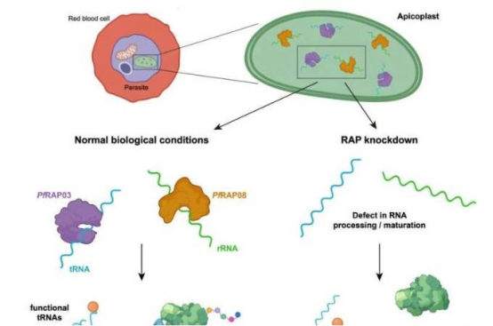 The researchers identified two RAP-family proteins (PfRAP03 and PfRAP08) in the apicoplast of Plasmodium falciparum. These proteins play essential roles by regulating the translation of RNA molecules within this parasite-specific organelle. Experiments showed that inhibiting either protein leads to parasite death.