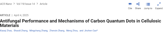 The paper, titled "Antifungal Performance and Mechanisms of Carbon Quantum Dots in Cellulosic Materials," was recently published in ACS Nano, with Ph.D. candidate Zhao Xiaoqi from Beijing Forestry University as first author and Professor Cao Jinzhen as corresponding author.