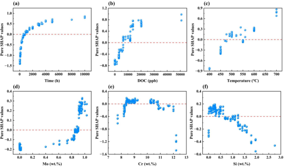 In the data-driven modeling aspect, the researchers proposed an interpretable machine learning (ML) model to predict the oxidative corrosion behavior of F/M steel in static LBE environments, establishing quantitative correlations between alloy composition, test conditions, and oxide film thickness. Through algorithm comparison and feature screening, a gradient boosting regression (GBR) model containing 9 key features was constructed. To enhance model interpretability, the SHAP method was introduced to quantify the independent contributions of important features and their nonlinear interaction effects, clearly identifying the optimal content ranges for key elements such as Mo, Cr, and Si, and proposing a multi-element synergistic optimization strategy to guide alloy design. This study provides new ideas for predicting liquid metal corrosion behavior and designing oxidation-resistant alloys, overcoming the limitations of traditional models in handling nonlinear complex relationships and the interpretability issues of machine learning models. The first author is PhD student Deng Chengmin from the Institute of Nuclear Energy Safety Technology, with Professor Zheng Mingjie and Assistant Researcher Xiong Jie from Shanghai University as corresponding authors. The research was supported by the National Natural Science Foundation of China Enterprise Innovation Joint Fund, the National Key R&D Program, and the Strategic Priority Research Program of the Chinese Academy of Sciences.