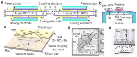 To address these challenges, the team developed a micro-electro-mechanical system (MEMS) pressure sensor. It integrates two resonant working modes into a single sensing element on one chip, enabling smooth operation across six orders of magnitude (from 0.3Pa to 100,000Pa). In the low-pressure range (0.3Pa to 1,000Pa), it uses a “mode localization” mode that amplifies tiny pressure changes into easily detectable signals. In the high-pressure range (1,000Pa to 100,000Pa), it automatically switches to the conventional resonant mode, which offers high accuracy and excellent stability.