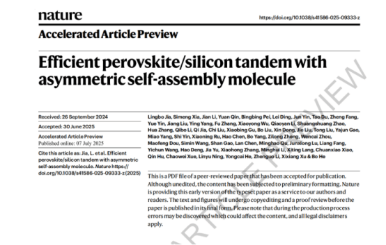 In recent years, crystalline silicon-perovskite tandem solar cells have developed rapidly, but the cells suffer from significant interfacial non-radiative recombination issues. Addressing the interfacial recombination caused by hole transport layers, the LONGi Green Energy team, in collaboration with Soochow University, has made breakthrough progress in the design of novel organic self-assembled monolayer (SAM) materials and in crystalline silicon-perovskite tandem devices. The related research results were published online on July 7 in the international academic journal Nature.