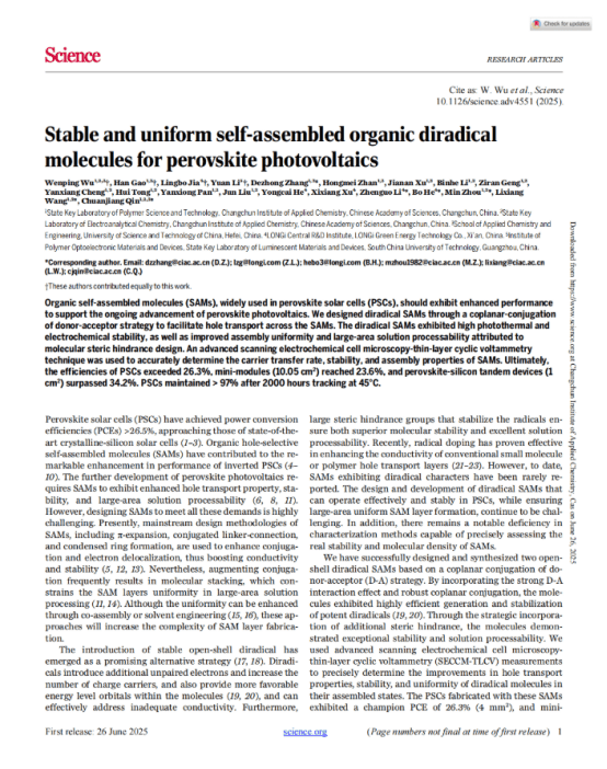 In addition, LONGi Green Energy, in collaboration with research teams including the Changchun Institute of Applied Chemistry of the Chinese Academy of Sciences, successfully developed a novel organic self-assembled molecule. This molecule exhibits excellent carrier transport capability, structural stability under real-world conditions, and outstanding assembly uniformity, leading to significant progress in both efficiency and stability of perovskite solar cells based on this material. The related research results were published on June 26 this year in the international academic journal Science.