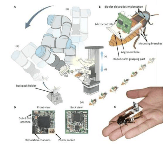 Unlike traditional robots, insect robots move naturally using all four limbs and are guided by mild electrical stimuli delivered through electrodes implanted via a lightweight circuit board on their backs. The artificial intelligence robotic assembly system uses computer vision and proprietary algorithms to precisely identify the optimal anatomical positions for implanting electrodes on the cockroach's back.