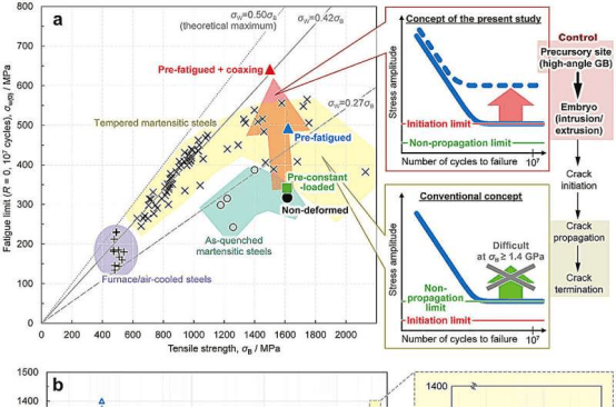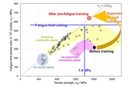 Unlike tempering heat treatment, pre-fatigue training can improve the fatigue limit while minimizing the loss of tensile strength, making it a promising method applicable to general high-strength steels. The study also shows that suppressing crack initiation, rather than traditional crack arrest, is the key to improving the fatigue limit of high-strength steel.