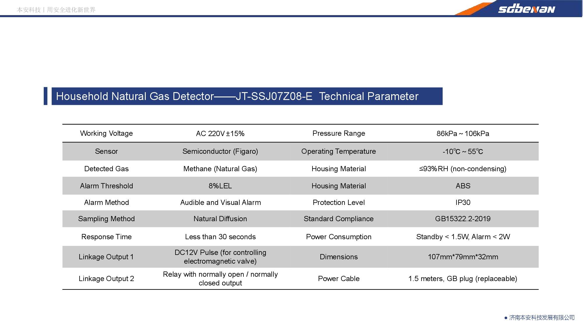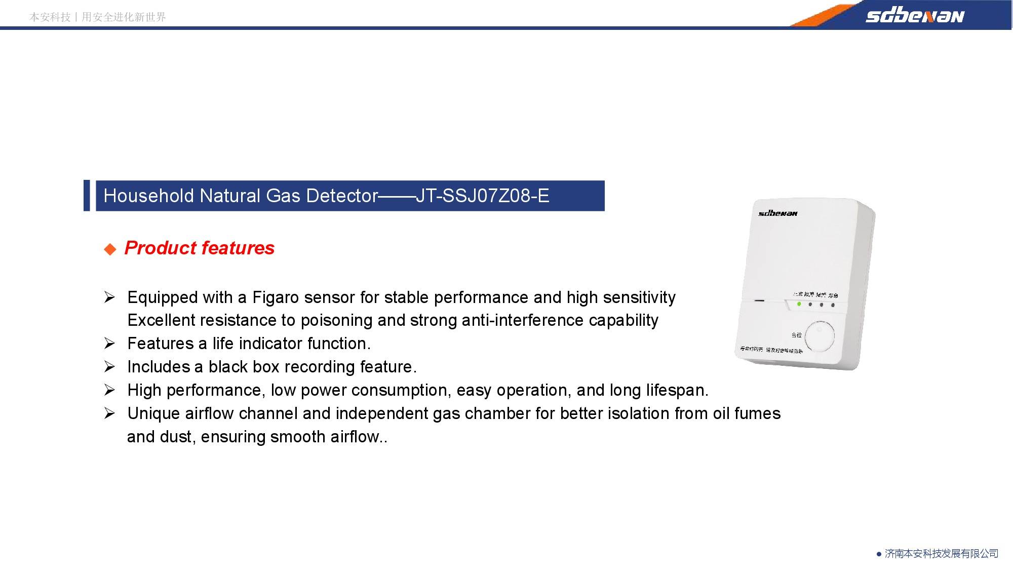 JT-SSJ07Z08-E The household liquefied gas detector is designed according to the GB15322.2-2019 standard, providing real-time detection of liquefied gas concentration in the environment. When the gas concentration exceeds the alarm threshold, it triggers audible and visual alarms and activates the electromagnetic valve to cut off the gas supply. This device is suitable for monitoring gas leaks from household liquefied gas cylinders.