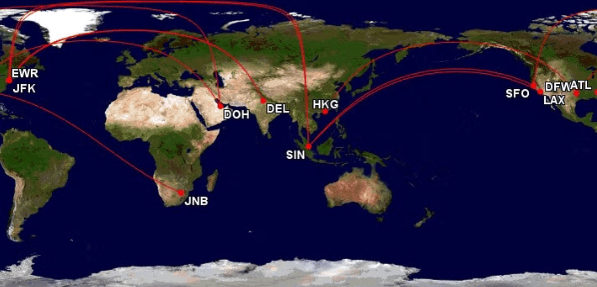 Cirium data shows that Singapore Airlines operates multiple routes among the top ten longest routes flown by the A350. In addition to the New York route, Singapore Airlines operates 10 weekly flights on the Los Angeles to Singapore route, with a flight time of approximately 17 hours and 50 minutes. Qatar Airways' Doha to San Francisco route is the longest service for the A350-1000 variant, with a flight time of 17 hours and 40 minutes. This route is currently suspended due to regional circumstances and is expected to resume in June 2026. Qatar Airways was the global launch customer for the A350, first putting it into commercial service in 2015.