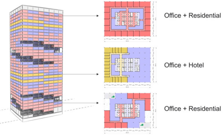 The MetaCore system offers environmental benefits for building adaptive reuse. According to research data cited by Schindler, renovating an office building generates approximately 220 kg of CO2 emissions per square meter, while constructing a new office building generates 475 to 560 kg per square meter. Renovation reduces carbon emissions by about 2.2 to 2.6 times compared to new construction. Financially, the system allows building owners to diversify income sources, reducing the risk of single-use assets becoming "stranded" due to market changes and extending the economic lifecycle of building adaptive reuse.
