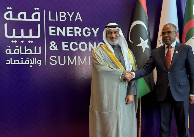 Libya's Acting Oil and Gas Minister Khalifa Abdulsadek and OPEC Secretary General Haitham Al Ghais shake hands during the Libya Energy & Economy Summit, in Tripoli, Libya January 18, 2025.