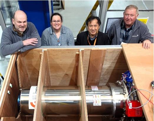 The gyrotron, with Morgan, left, Sakamoto, third from left, Emma Wooldridge, heating and current drive team leader, second left, and Vladimir Shevchenko, senior technical advisor