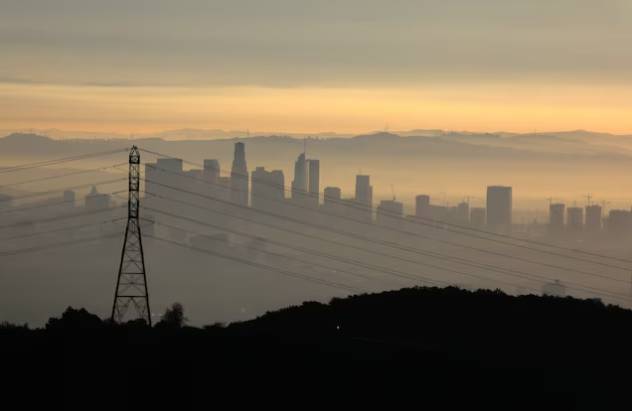 The downtown Los Angeles skyline is seen behind an electricity pylon at sunrise in Los Angeles, California, U.S. November 8, 2017.