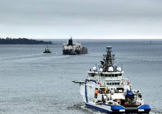 Finnish Border Guard's ship Turva escorts Cook Islands-registered oil tanker Eagle S out to sea on the Baltic, March 2, 2025