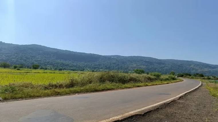 A view containing the road and the hills beside the Thokarwadi Dam in Maharashtra, India.