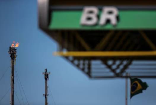 The logo of state-run oil company Petrobras is seen in front of the Brazilian national flag at the Alberto Pasqualini Refinery in Canoas, Rio Grande do Sul state, Brazil, October 25, 2021.