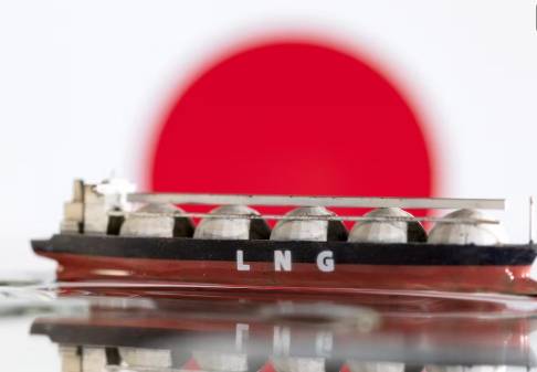 Model of LNG tanker is seen in front of Japan's flag in this illustration taken May 19, 2022.