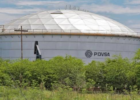 The logo of the state oil company PDVSA is seen on an oil tank container in an oil facility, in Lagunillas, Venezuela, October 14, 2022.