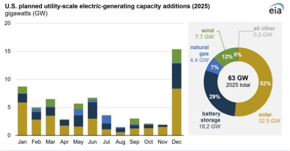 Battery energy storage is also seeing remarkable growth, complementing the rise in solar power. In 2024, a record 10.3 GW of grid-scale storage was installed. The EIA forecasts an even larger increase for 2025, with 18.2 GW of new battery storage capacity, representing a 70% growth from the 26 GW accumulated by the end of 2024. This follows a 66% increase in 2024. California hosts about half of the country’s grid-scale storage capacity.