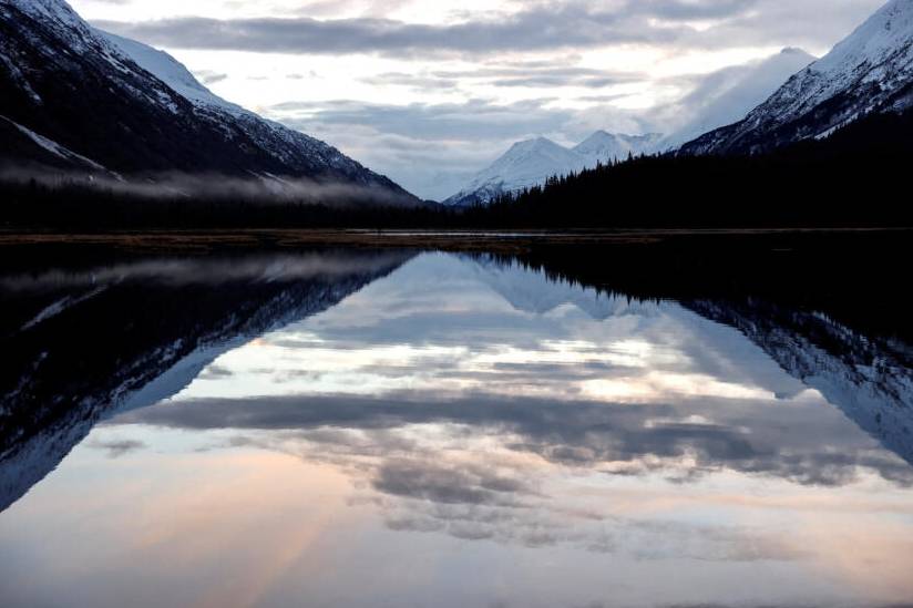 Snow capped mountains are reflected in Kenai Lake outside of Cooper Landing, in Anchorage, Alaska.