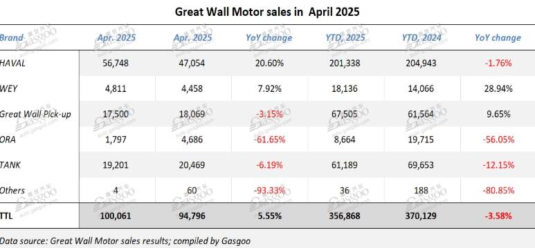 Wedoany.com Report-May 8, In April 2025, Great Wall Motor (GWM) reported sales of 100,061 new vehicles, reflecting a 5.55% increase compared to the previous year. Vehicles priced above 200,000 yuan totaled 26,360 units, up 2.87% year-on-year, while new energy vehicle (NEV) sales surged by 28.42% to 28,813 units.