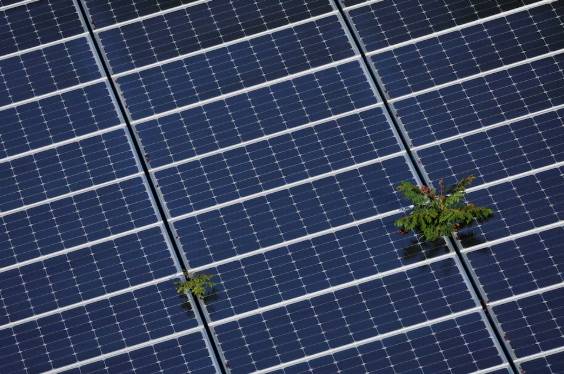 Plants grow through an array of solar panels in Fort Lauderdale, Florida, U.S., May 6, 2022.