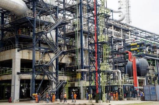 Workers stand in front of the Mild Hydrocracking Unit (MHC) at the Dangote Petroleum Refinery in Lagos, Nigeria, July 20, 2024.