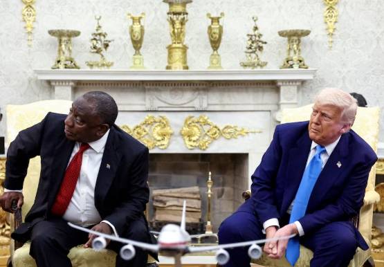 U.S. President Donald Trump and South African President Cyril Ramaphosa looks towards a monitor (not pictured) that shows videos allegedly pertaining to the genocide of white people in South Africa, in the Oval Office of the White House in Washington, D.C., U.S., May 21, 2025.