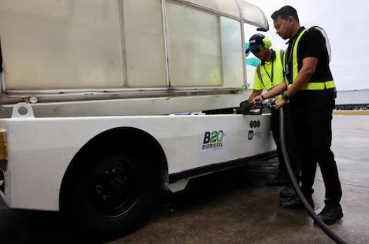 Ground crew refuel the mobile luggage conveyor with B20 biodiesel at the Kuala Lumpur International Airport in Sepang, Malaysia May 29, 2025.
