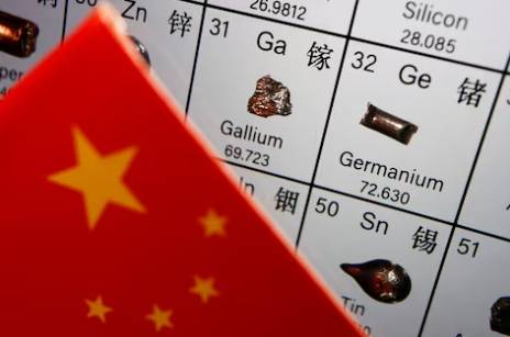The flag of China is placed next to the elements of Gallium and Germanium on a periodic table, in this illustration picture taken on July 6, 2023.