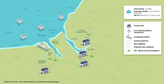 The Liverpool Bay CCS project, part of the HyNet Cluster, aims to transport CO2 from industrial plants in North West England and North Wales to permanent storage in Eni’s depleted natural gas reservoirs beneath the Liverpool Bay seabed. The project involves repurposing 149 kilometers of existing onshore and offshore pipelines and constructing 35 kilometers of new pipelines to connect industrial emitters to the CCS network. It also includes adapting offshore platforms for CO2 storage.