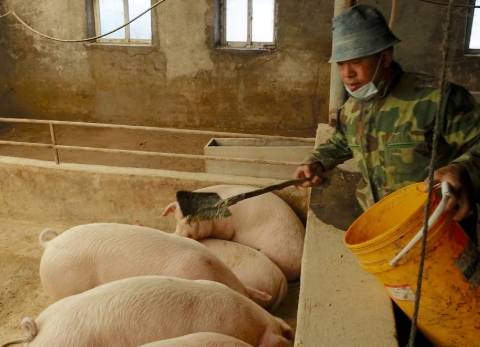 Pig farmer Han Yi feeds pigs on his farm at a village in Changtu county, Liaoning province, China January 17, 2019.