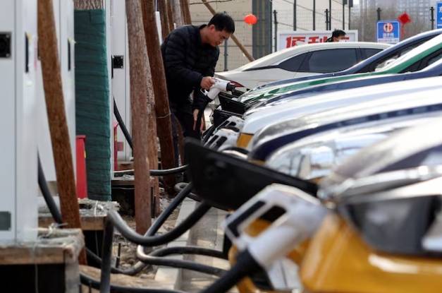 A man holds a charging plug to charge a car at an electric vehicle (EV) charging station in Beijing, China February 2, 2024.