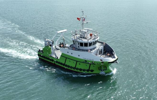 Tor Boreas, designed by Macduff Ship Design and constructed by Tor Marine in Türkiye, measures 26.95 meters in length, 11 meters in breadth, with a 4.35-meter depth and a maximum draught of 3.5 meters. It features an offshore crane, a 5-tonne hydraulic A-frame, and towing capabilities with a 25-tonne electric aft winch and a 17-tonne bollard pull. The vessel’s diesel-electric powertrain and IMO Tier III exhaust system ensure efficient fuel use and reduced emissions compared to traditional diesel vessels.