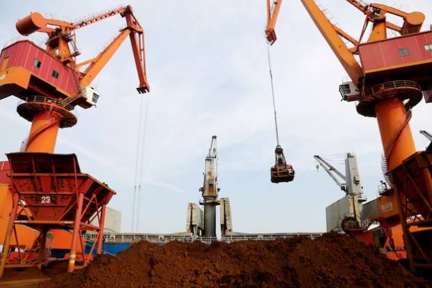 Cranes unload imported iron ore from a cargo vessel at a port in Lianyungang, Jiangsu province, China October 27, 2019.