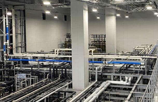 Ultrapure water manufacturing system used to conduct the demonstration test at Kurita Innovation Hub; the blue pipes are the pipes under demonstration