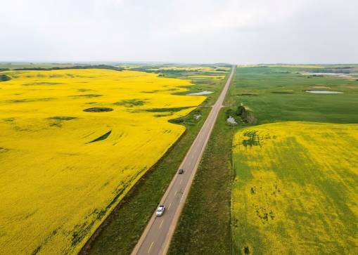 A drone view shows a canola field flowers, on a farm near Blaine Lake, Saskatchewan, Canada, July 19, 2025.