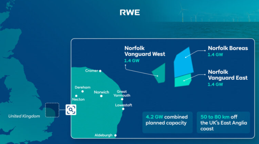 RWE acquired Norfolk Vanguard East, Norfolk Vanguard West, and Norfolk Boreas from Vattenfall in March 2024. Together, these projects represent a total capacity of 4.2 GW and have secured seabed rights, grid connections, Development Consent Orders, and other necessary permits. A spokesperson for RWE stated: “Norfolk Vanguard West and Norfolk Vanguard East are the most advanced and have secured the procurement of most key components.”