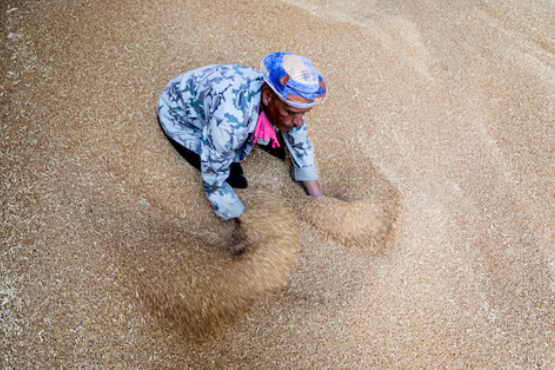 A worker collects wheat at the Benha grain silos in Al Qalyubia Governorate, Egypt, May 19, 2022.