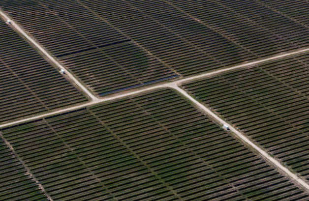 An aerial view shows rows of solar panels at a solar farm in Anson, Texas, U.S., April 23, 2025.