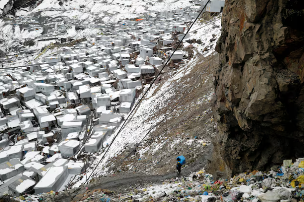 A man carrying food for miners, walks towards a gold mine in La Rinconada, the Andes, Peru, October 7, 2019.
