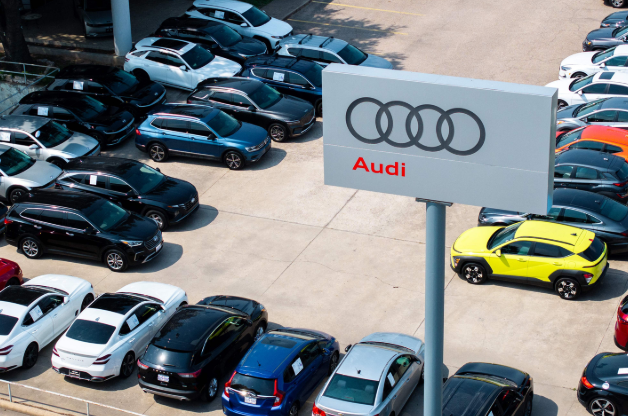 In this aerial view, vehicles are displayed for sale on a lot at the Audi South Austin dealership on May 16 in Austin, Texas.