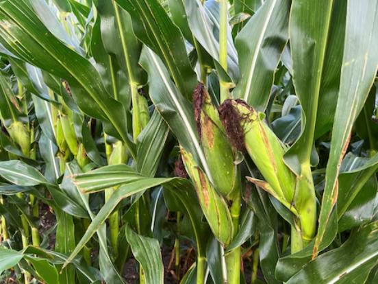 Ears of corn are pictured after an early August rain shower, near West Point, Iowa, U.S., August 5, 2023.