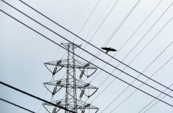 A crow flies between electric power transmission lines in Yokohama, south of Tokyo, September 15, 2014.