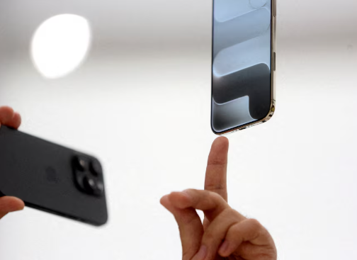 A person points to an iPhone during Apple's event at the Steve Jobs Theater on its campus in Cupertino, California, U.S. September 9, 2025.
