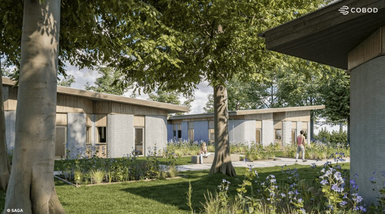 Architecturally, the structures feature slanted ceilings and large roof windows to enhance natural lighting. The six buildings are positioned around a central shared courtyard, which includes landscaped gardens, pedestrian pathways, and bicycle parking facilities. The layout aims to create a sustainable and community-oriented environment, blending modern design with the natural surroundings.