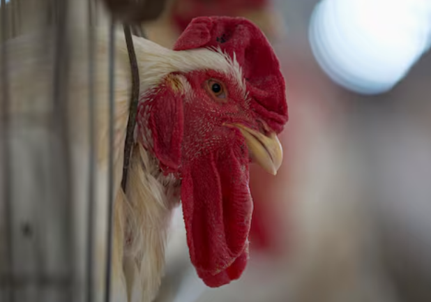 A rooster looks out of a cage at an hatchery in Mangaon, south of Mumbai February 2, 2015.