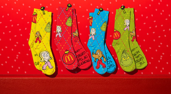 Adding to the festive appeal, every Grinch Meal includes one pair of exclusive collectible socks featuring playful quotes and imagery from the Grinch. Available in four vibrant colors, the socks are crafted to serve double duty as impromptu holiday stockings, encouraging customers to hang them by the fireplace or use them as gift packaging.